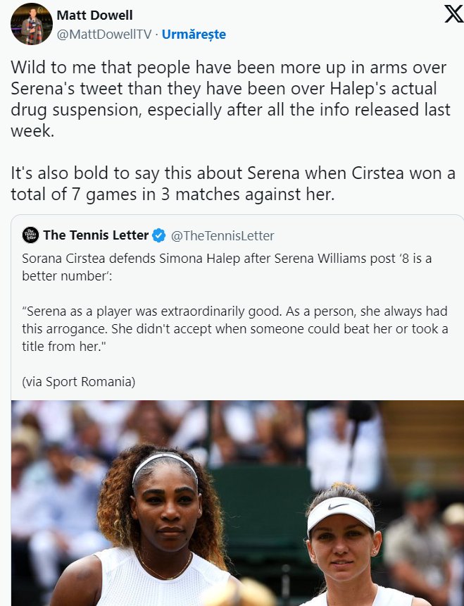 „Mi se pare incredibil că se vorbește mai mult de postarea Serenei pe Twitter decâ despre suspendarea lui Halep pentru că a folosit substanțe interzise. De asemeena, Cîrstea are tupeu să vorbească despre Serena, având în vedere că i-a luat doar 7 game-uri în 3 meciuri”, a scris Matt Dowell, jurnalist la FOX, pe rețeaua de socializare X.