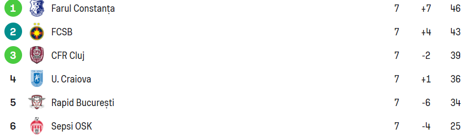 Deşi mai are şanse matematice, CFR este la 7 lungimi de liderul Farul şi doar un joc favorabil al rezultatelor ar mai putea să o ajute să îşi apere titlul cucerit de fiecare dată din 2018 încoace. Farul şi FCSB sunt despărţite de 3 puncte cu 3 runde înaintea finalului de sezon, unul în care cele două se vor întâlni şi în meci direct pe litoral.