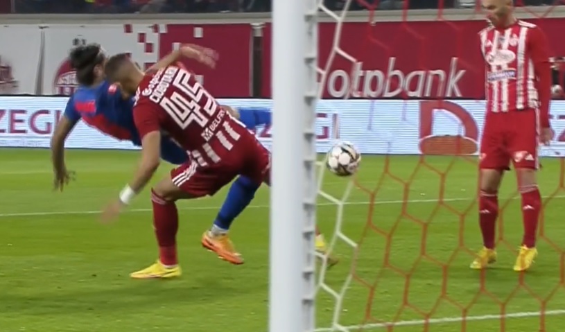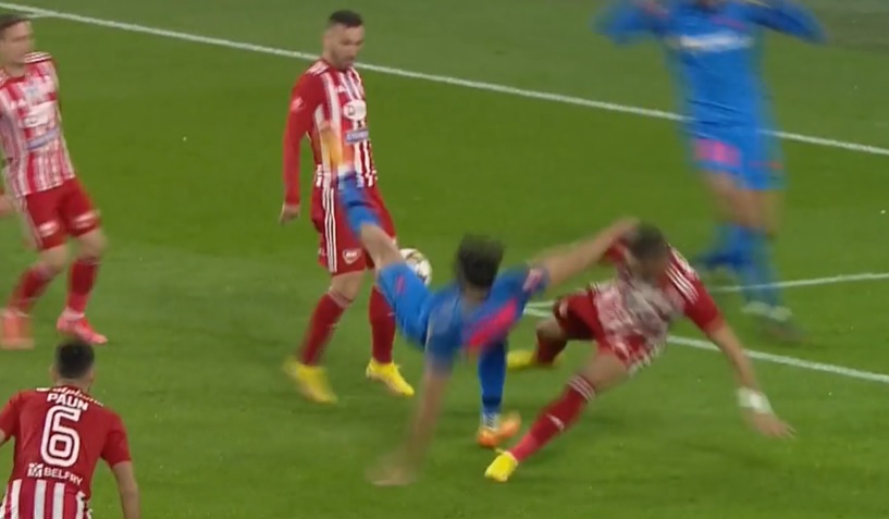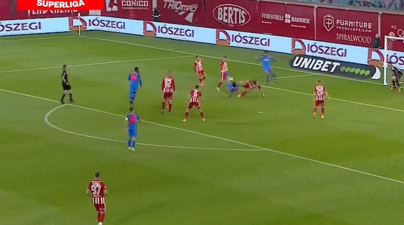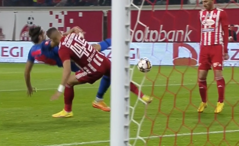 Italianul a primit o minge de la Omrani, a preluat excelent în careu, s-a înșurubat în jurul lui Ciobotariu și a căzut. Arbitrul Marcel Bârsan a fost impresionat de cădere și a dictat penalty.