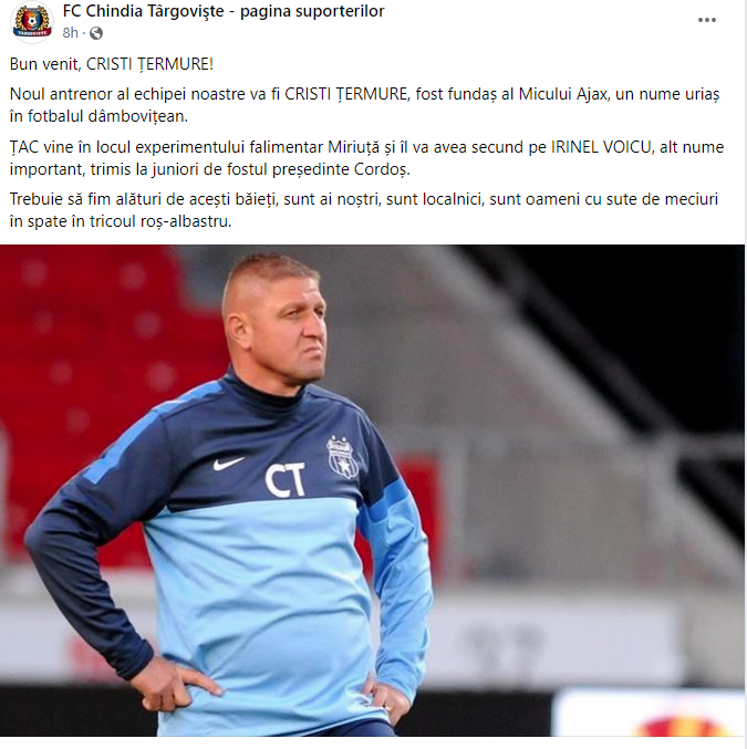 La scurt timp, pe aceeași pagină a fost dezvăluit faptul că noul antrenor al Chindiei va fi Cristian Țermure, fostul secund al lui Laurențiu Reghecampf de la FCSB.