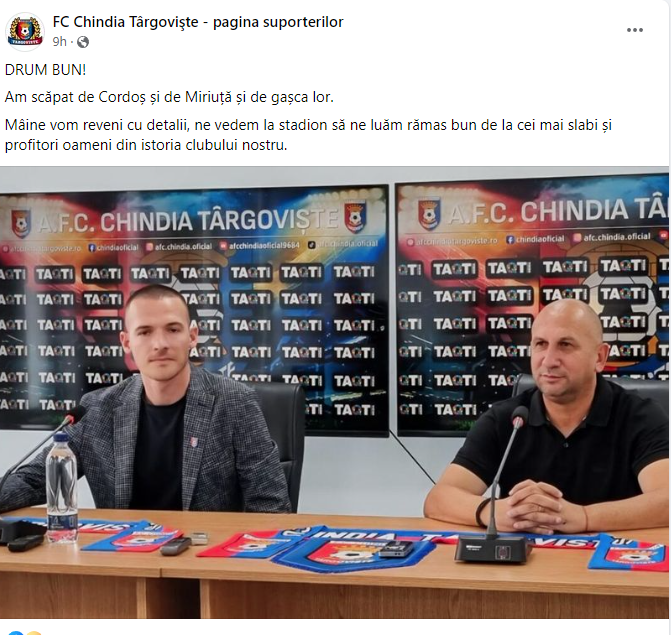 La miezul nopții, pagina de Facebook a suporterilor Chindiei a postat un mesaj „acid” prin care a anunțat că formația târgovișteană se va despărți de președintele Andrei Cordoș și antrenorul Vasile Miriuță.