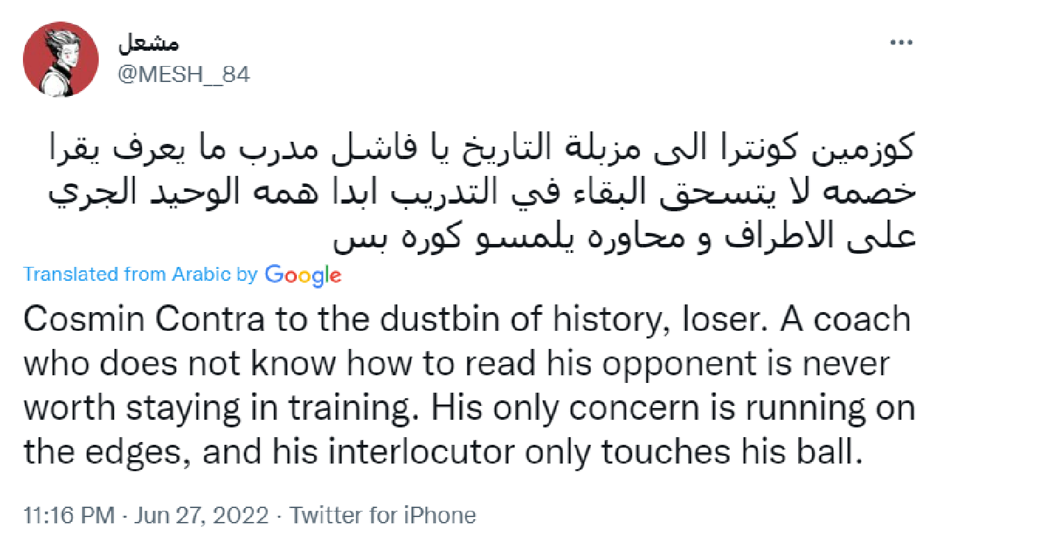Cosmin Contra va rămâne în tomberonul istoriei, un pierzător! Un antrenor care nu știe să-și citească adversarul nu merită niciodată să rămână pe banca unei echipe. Singura lui preocupare este ca jucătorii să alerge pe flancuri, iar mijlocașii să atingă mingea”, a scris un fan al lui Al-Ittihad pe Twitter.