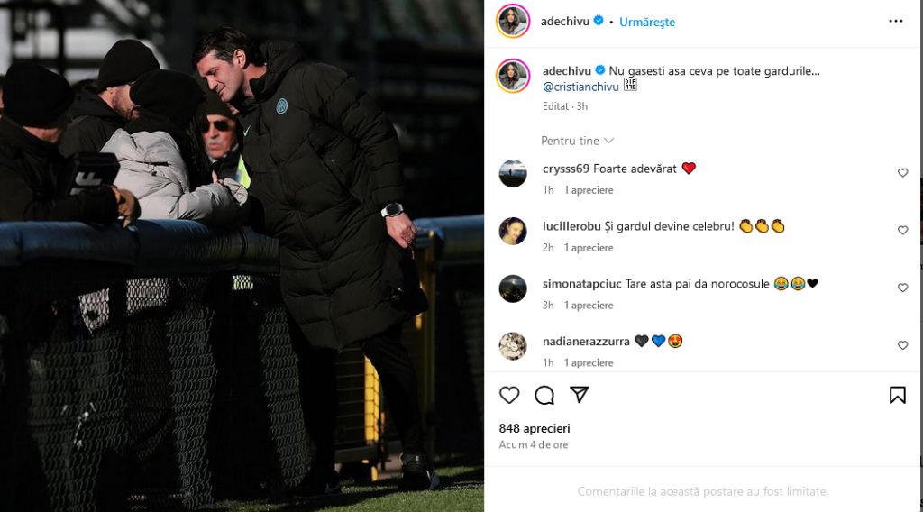 Cristi Chivu și soția sa apar într-o serie de imagini postate de Adelina pe Instagram. Ea și-a susținut soțul de la marginea terenului la meciul Inter U19 – Sampdoria U19.