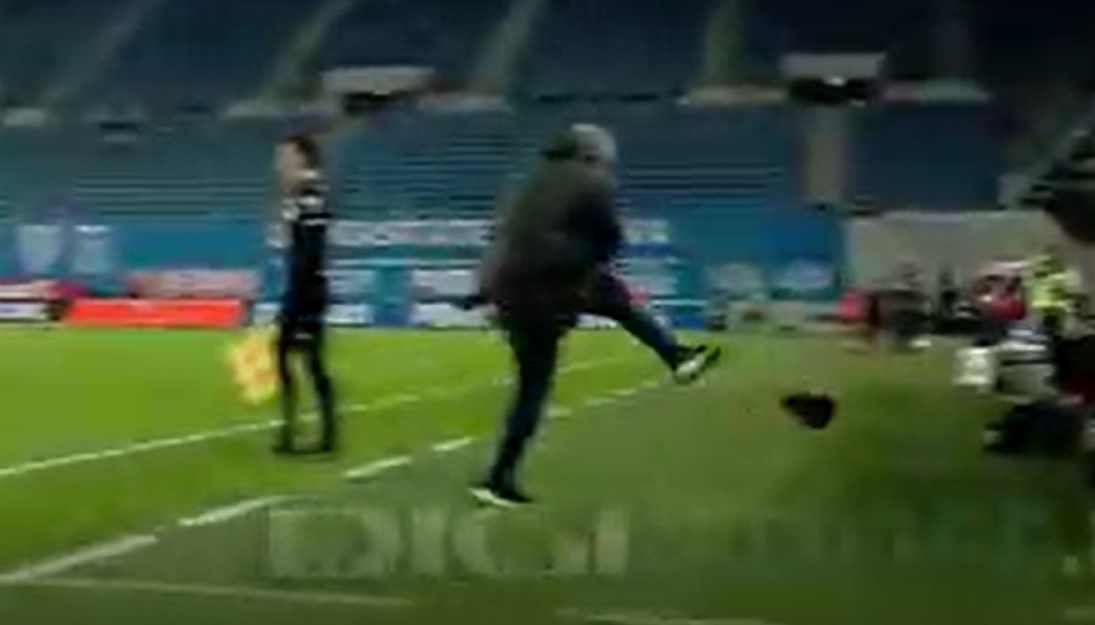 În urma unui șut slab efectuat de jucătorii săi, antrenorul s-a manifestat violent. Și-a pus mâinile pe cap, a gesticulat nervos, a strigat la jucători și a șutat în fesul cu însemnele clubului, pe care îl purta.