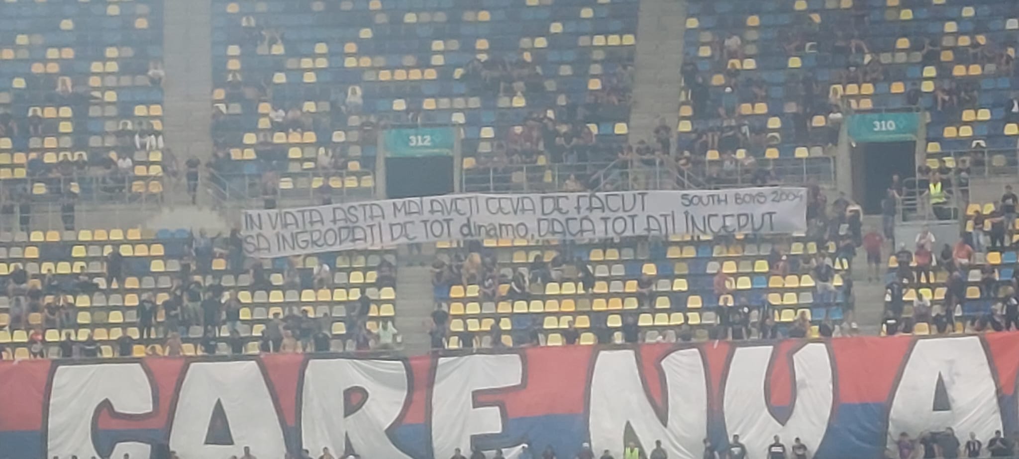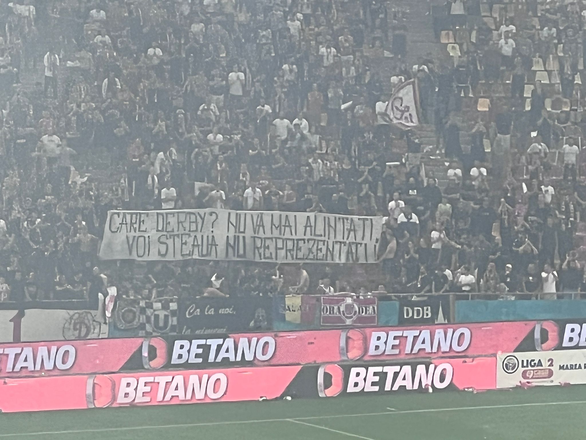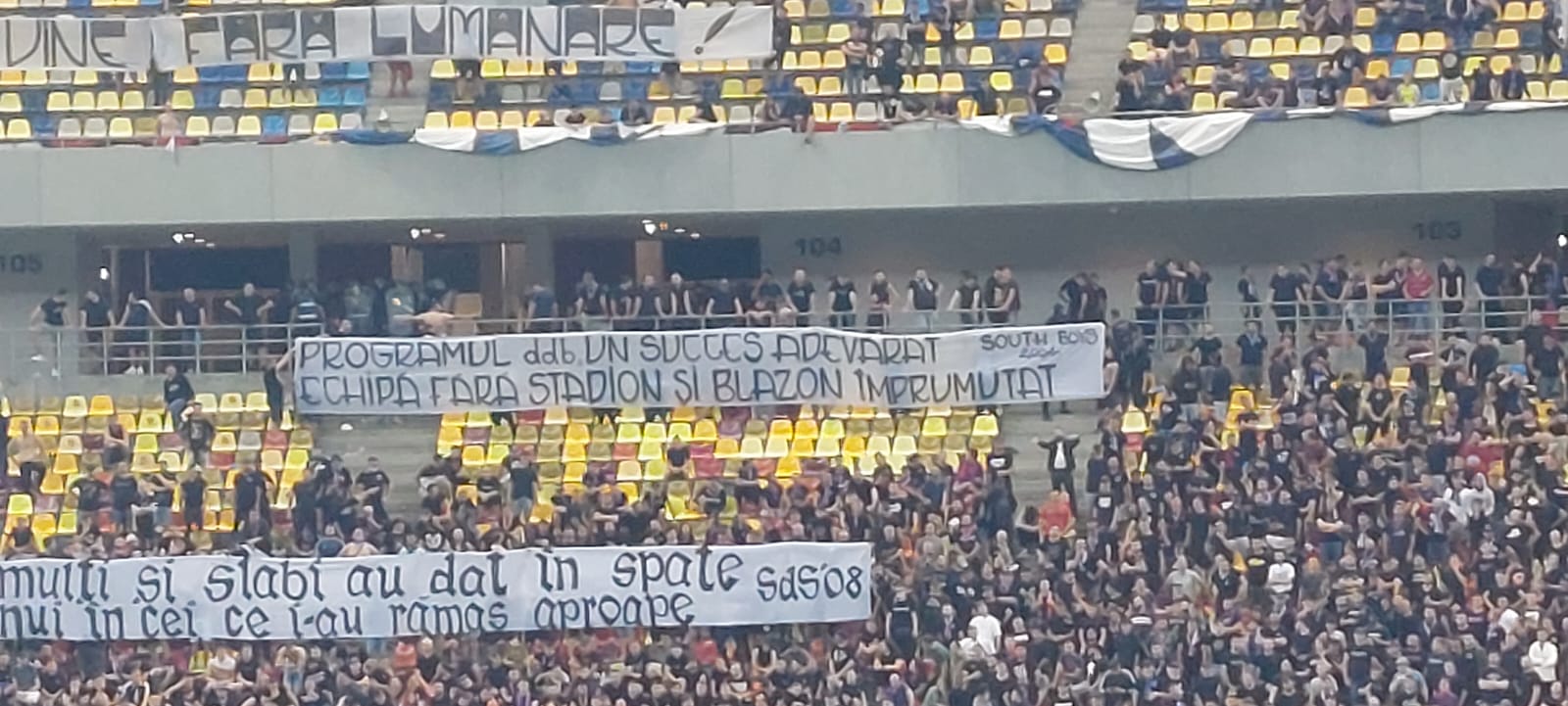 Pe cealaltă parte, roș-albaștriii, de la inelul 1 sau 3, au aruncat mesaje către „câini”, ironizând situația financiară precară a clubului, dar și Programul DDB, tot mai contestat în ultimele luni.
