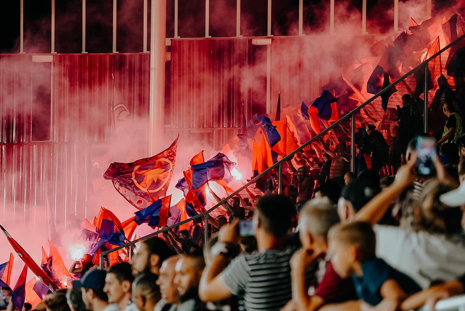 Ulterior acestui banner, galeria oaspete a fluturat steaguri roș-albastre și a pregătit un mic spectacol pirotehnic.