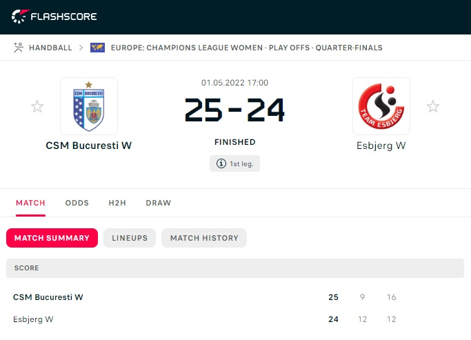 CSM București și Team Esbjerg s-au întâlnit în Sala Polivalentă din București, în meciul tur din sferturile de finală ale Ligii Campionilor. Danezele s-au impus cu 26-25, cu o aruncare în ultima secundă.