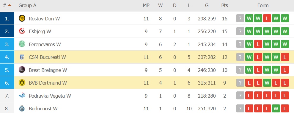 CMS București a trecut cu 33-29 de Borussia Dortmund și adună 12 puncte în Grupa A a Ligii Campionilor. Bucureștencele sunt pe locul 4. Primele șase formații merg mai departe. Primele două clasate direct în sferturi de finală, iar următoarele patru într-un baraj pentru a ajunge în această fază.