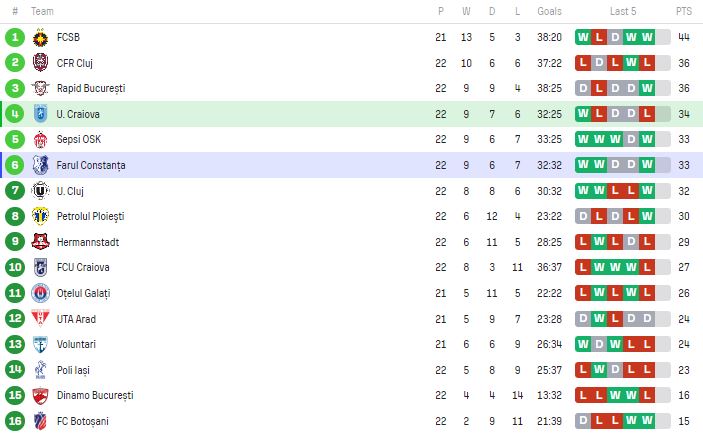 Locurile de play-off sunt completate de Sepsi, 33 de puncte și U Cluj, cu 32 de puncte. Farul e pe șapte, cu 30 de puncte, la egalitate cu Farul. Însă, echipa lui Gică Hagi are un meci în minus față de cele trei menționate, pretendente la play-off. „Regele” n-are de ales, trebuie să joace totul pe atac pentru a nu consemna un sezon eșuat. În plus, reprezintă un meci de orgoliu. Rămânerea pe loc de play-out ar însemna o puternică lovitură pentru campioana României.