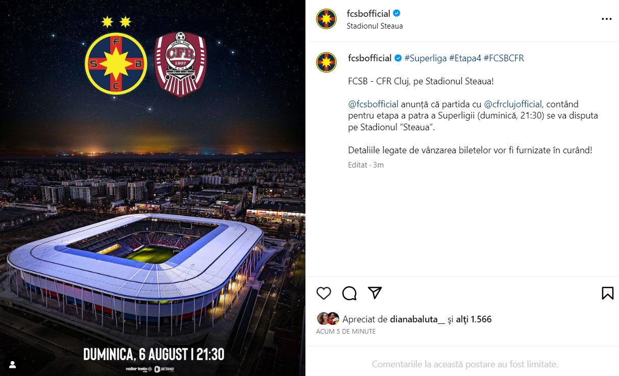 @fcsbofficial anunță că partida cu @cfrclujofficial, contând pentru etapa a patra a Superligii (duminică, 21:30) se va disputa pe Stadionul ”Steaua”.