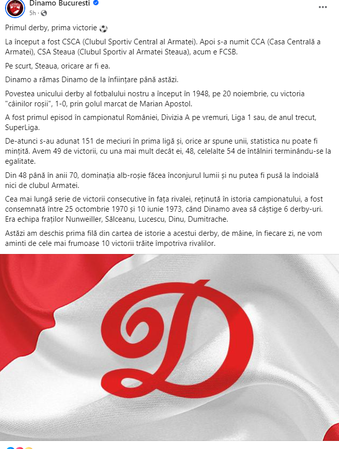 Cea mai lungă serie de victorii consecutive în fața rivalei, reținută în istoria campionatului, a fost consemnată între 25 octombrie 1970 și 10 iunie 1973, când Dinamo avea să câștige 6 derby-uri. Era echipa fraților Nunweiller, Sălceanu, Lucescu, Dinu, Dumitrache. Astăzi am deschis prima filă din cartea de istorie a acestui derby, de mâine, în fiecare zi, ne vom aminti de cele mai frumoase 10 victorii trăite împotriva rivalilor”.