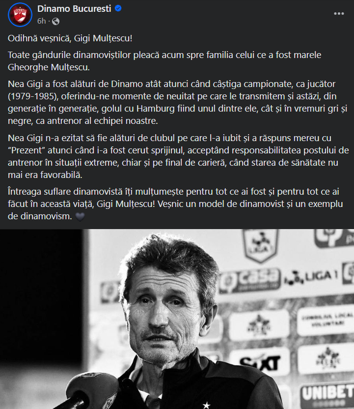 Clubul Dinamo, acolo unde Gigi Mulțescu și-a trăit cele mai glorioase momente ca jucător și unde a revenit de nenumărate ori în calitate de antrenor, chiar și în situații critice, a publicat un mesaj emoționant în care a omagiat viața și cariera celui care a fost un adevărat simbol al clubului.