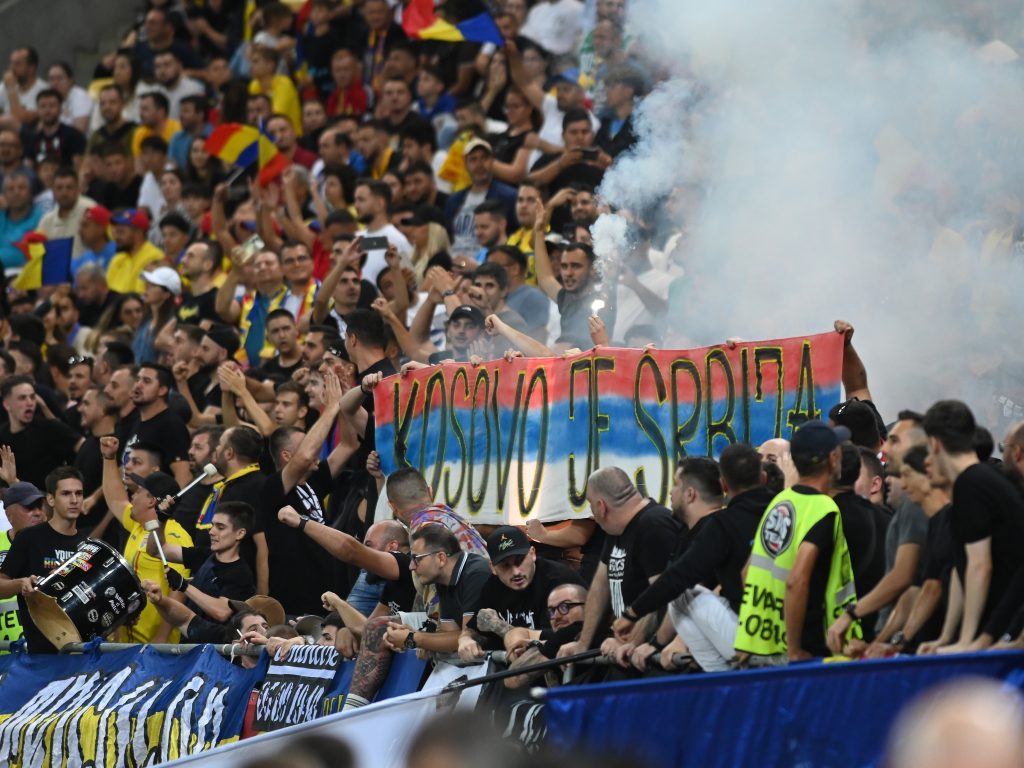 În prima repriză, în peluza în care stăteau ultrașii români, au fost afișate mesajele „Kosovo e Serbia” și „Basarabia e România”, fiind urmate de scandări cu același mesaj.