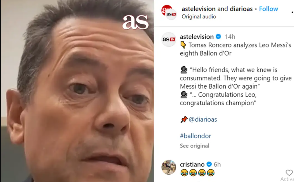 Cristiano Ronaldo a fost lăsat pentru prima dată în afara listei finaliștilor pentru câștigarea Balonului de Aur, după 20 de ani. Lusitanul a apreciat și a lăsat în comentarii 4 emoji-uri cu o față care râde cu lacrimi, la un videoclip postat pe Instagram de către jurnalistul Tomas Roncero, care contestă faptul că Messi a câștigat.