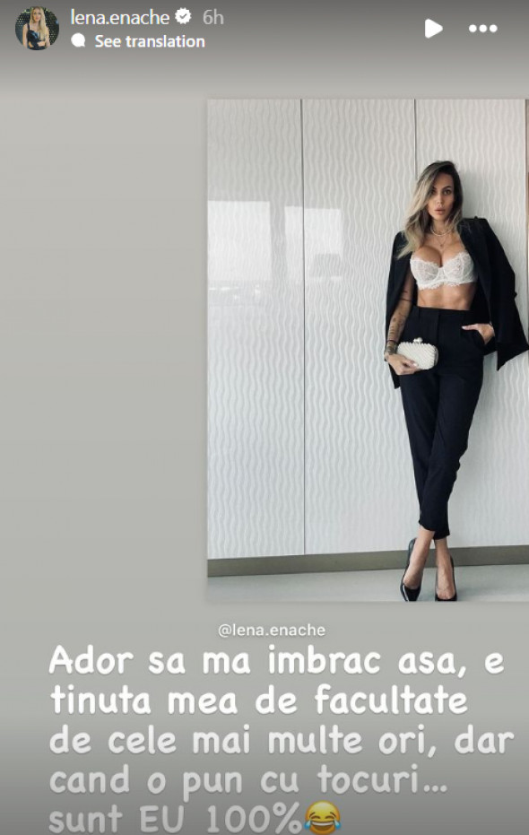 Ador să mă îmbrac așa, e ținuta mea de facultate de cele mai multe ori, dar când o pun cu tocuri… Sunt eu 100%.”, a scris soția fotbalistului Gabi Enache, pe pagina sa de Instagram.