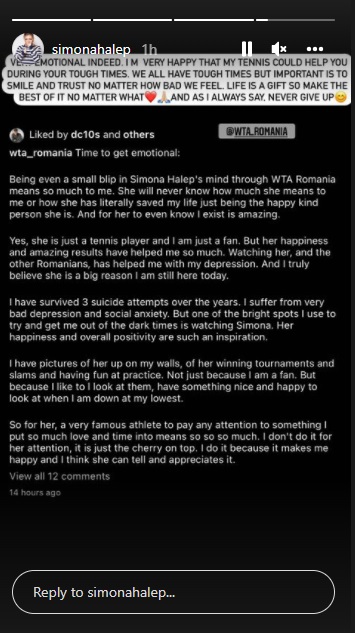 Da, ea este doar o jucătoare de tenis și eu doar un fan. Dar fericirea ei și rezultatele uimitoare pe care le-a obținut m-au ajutat atât de mult. Privirea ei, și a celorlalți români, m-a ajutat cu depresia mea. Cred, cu adevărat, că ea reprezintă un motiv important pentru care sunt și astăzi aici.