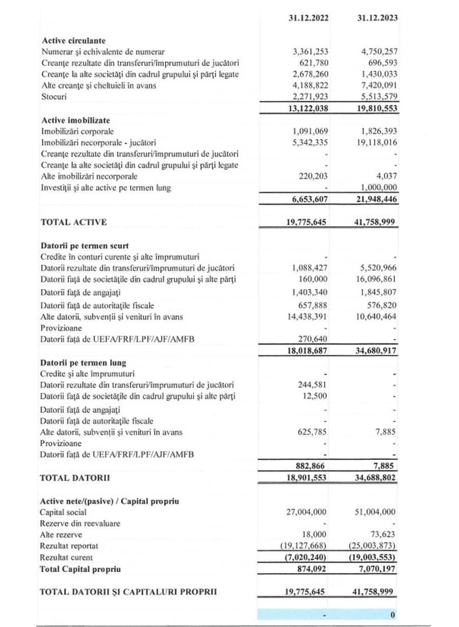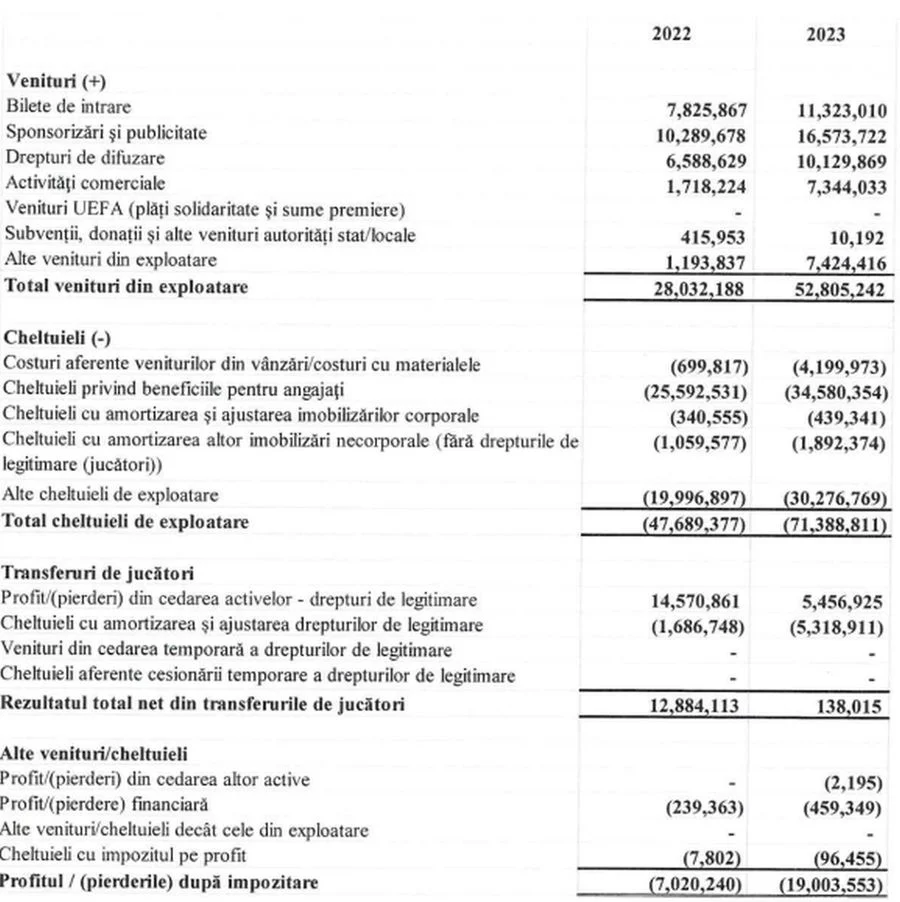 Pe de altă parte, banii cheltuiți pe aducerea de jucători au cunoscut o creștere importantă, trecând de la 337.000 de euro la 1,06 milioane de euro. În final, beneficiul a fost mult mai mic. Astfel, la capitolul plecări/veniri, profitul înregistrat anul trecut a fost de doar 27.600 de euro, comparativ cu 2,57 milioane de euro în 2022.
