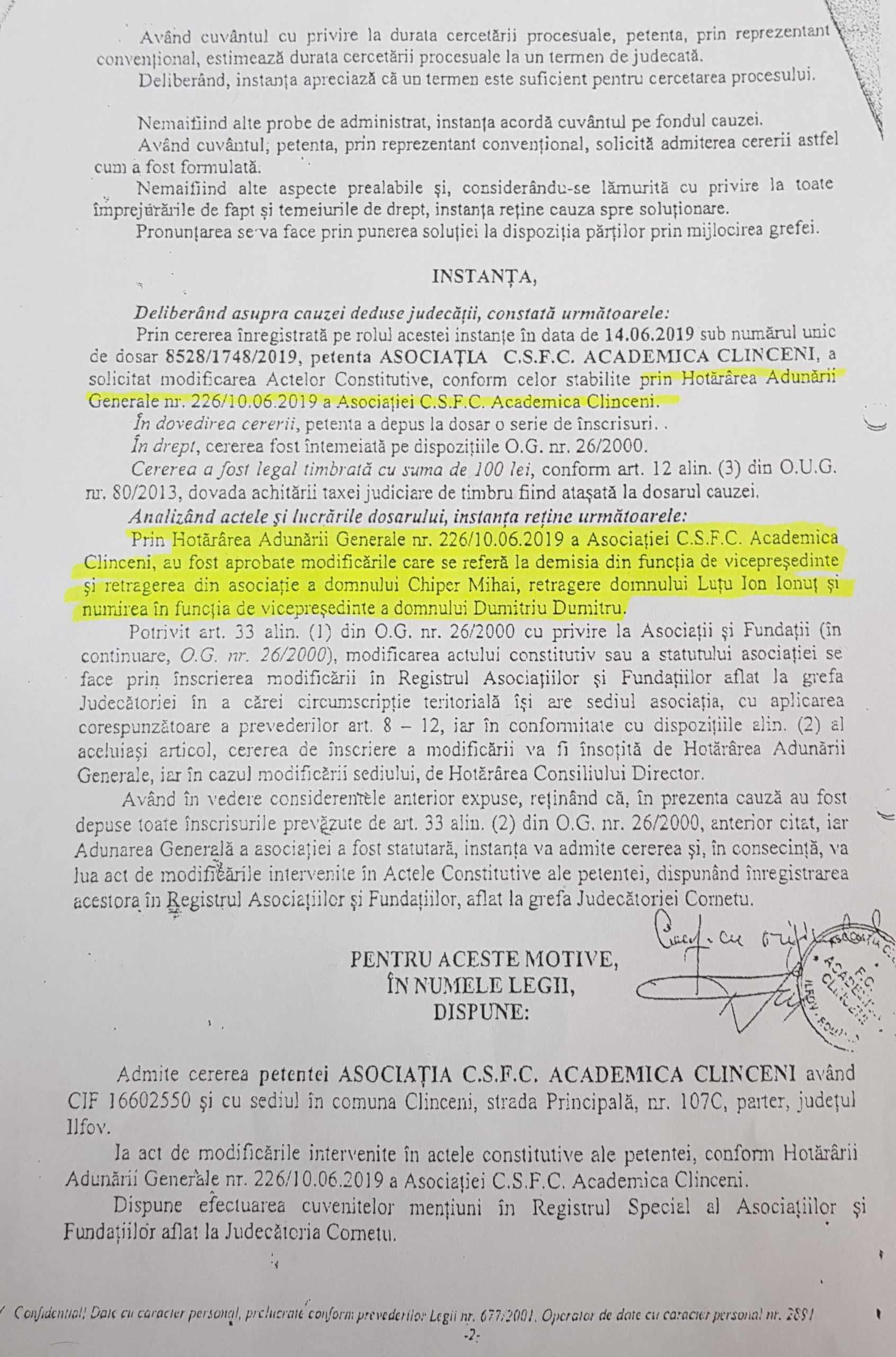 „Prin Hotărârea Adunării Generale nr 226/ 10.06.2019 a Asociației C.S.F.C. Academica Clinceni, Judecătoria Cornetu a aprobat modificările care se referă la demisia din funcția de vicepreședinte și retragerea din asociație a domnului Chiper Mihai, retragerea domnului Luțu Ion Ionuț și numirea în funcția de vicepreședinte a domnului Dumitriu Dumitru”, (n.r. fostul antrenor al Stelei din anii 90).