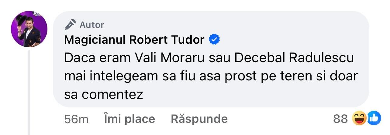 „Dacă eram Vali Moraru sau Decebal Rădulescu, mai înțelegeam să fiu așa prost pe teren și doar să comentez”, a comentat Magicianul Robert Tudor, pe Facebook.