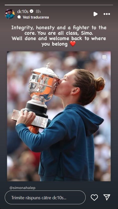 „Integritate, onestitate și o luptătoare până în măduva oaselor. Ești extraordinară, Simo! Bravo și bine ai revenit acolo unde îți e locul”, a scris Darren Cahill, lângă o fotografie cu Halep și trofeul de la Roland Garros.