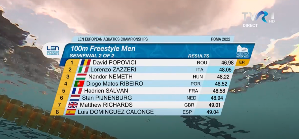 David Popovici (17 ani) s-a calificat, vineri, în finala probei de 100 metri liber, la Campionatul European de natație pentru seniori de la Roma.