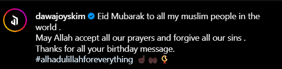 „Eid Mubarak (n.r- „Sărbătoare binecuvântată”, urarea care se folosește la finalul Ramadanului) pentru toți musulmanii din lume. Fie ca Allah să vă asculte rugăciunile și să vă ierte păcatele. Vă mulțumesc și pentru urările cu ocazia aniversării mele”