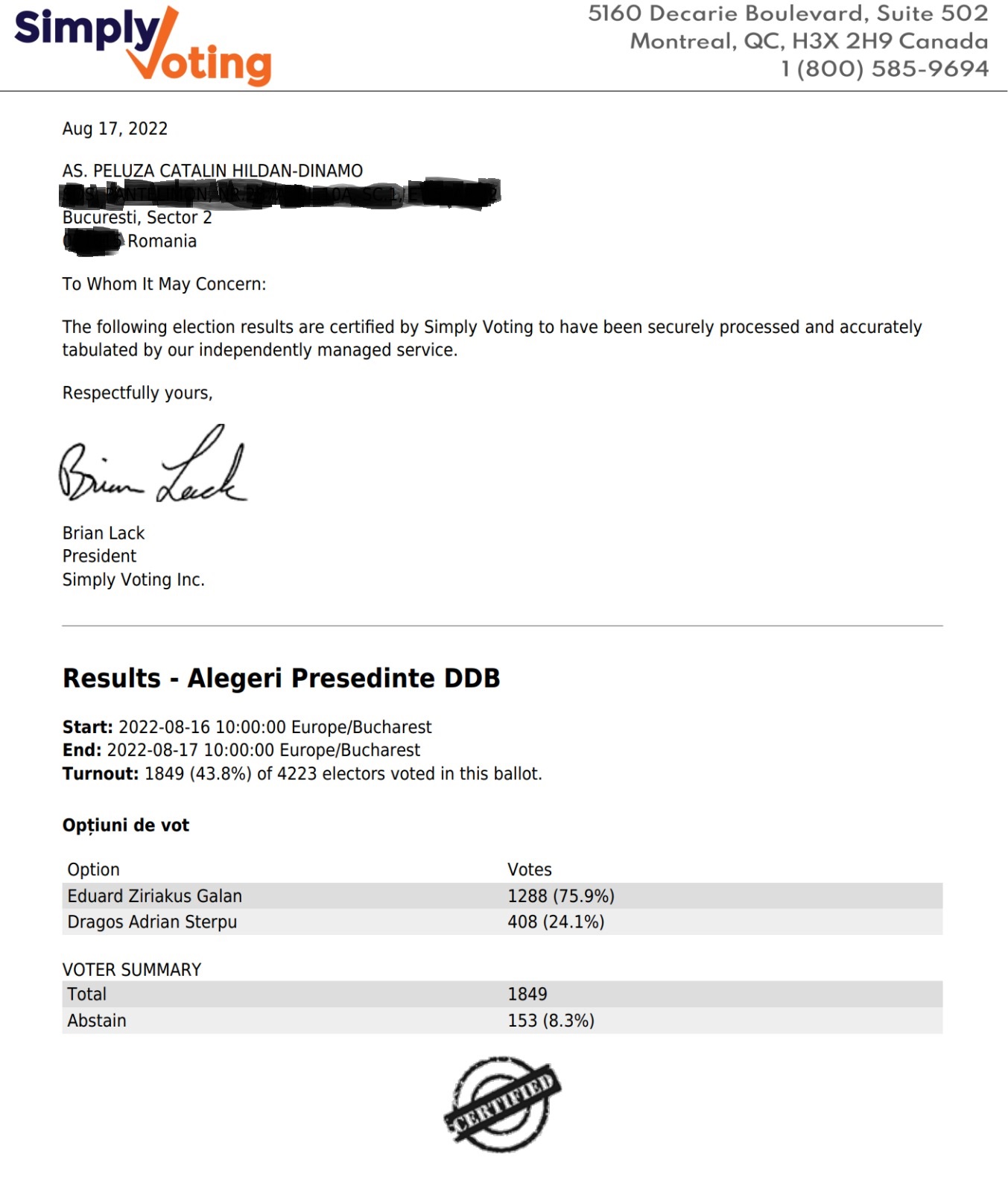 Rezultatele finale au fost certificate de către platforma simplevoting.com. Au avut drept de vot doar membrii cu card DDB activ, care au împlinit vârsta de 18 ani. Baza de date a fost transmisă către platforma de votare la data de 1 august.