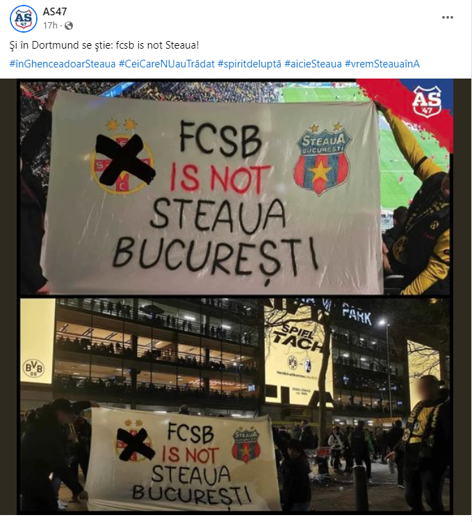 Pagina de Facebook „AS47” a postat mai multe fotografii cu „isprava” suporterilor CSA, alături de mesajul: „Şi în Dortmund se ştie: fcsb is not Steaua!”.