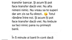 Îți dau 20.000 de euro pentru o noapte. Totul rămâne între noi. Îți dau toți banii înainte. Cash sau transfer bancar. Și acum îți pot face transfer dacă vrei. Nu află nimeni nimic. Nu vreau să te superi, dar am zis să fiu direct. Totul rămâne între noi. Și acum îți pot face transfer dacă vrei. Nu trebuie să faci nimic până nu primești banii. În 5 minute ai banii în cont dacă vrei”, a mai spus internautul.