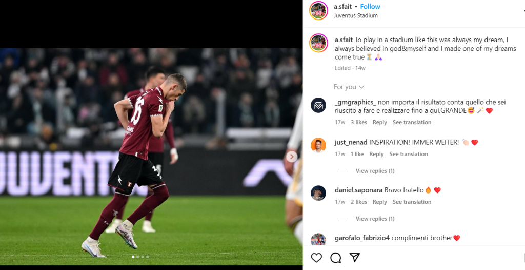 Tot în luna ianuarie a acestui an, emoționat de experiența avută în Cupa Italiei împotriva celor de la Juventus, Sfait a postat pe contul său de Instagram un mesaj în care și-a exprimat bucuria. „Să joc pe un stadion ca acesta a fost întotdeauna visul meu. Am crezut mereu în Dumnezeu și am făcut ca visul să devină realitate”, a scris Sfait.