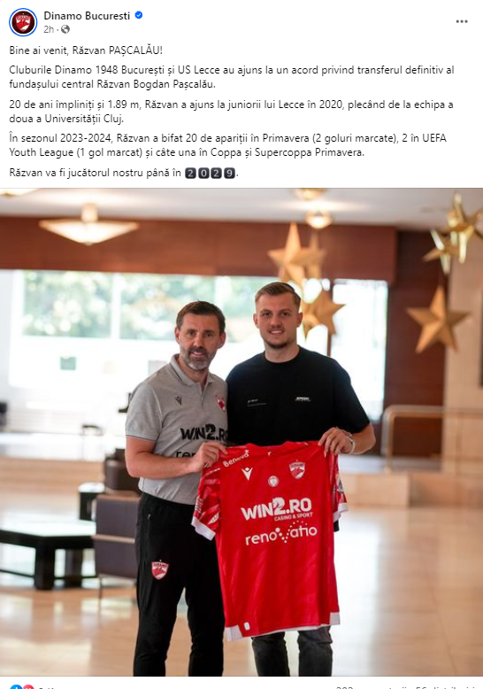 Concret, Dinamo a anunțat că a ajuns la o înțelegere cu Lecce în privința transferului definitiv al lui Răzvan Pașcalău, care bifează astfel prima experiență la nivel de senior. Mesajul de pe rețelele de socializare a fost însoțit de o fotografie realizată alături de tehnicianul croat.