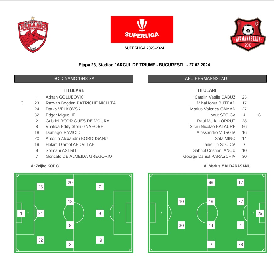DINAMO (3-4-3): Golubovic – Edgar Ie, Velkovski, Patriche (cpt.) – De Moura, Gnahore, Pavicic, Bordușanu – Abdallah, Astrit, Gregorio