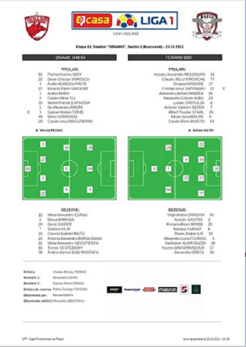 RAPID: 31. H. Moldovan – 77. Belu, 22. Săpunaru, 27. Dr. Grigore, 3. Florică – 4. Crepulja, 23. Albu – 7. Sefer, 10. R. Ilie, 94. Hlistei – 9. Ad. Bălan