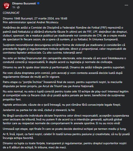 Dinamo va lupta cu toate forțele, transparent și regulamentar, pentru dreptul suporterilor noștri de a fi alături de echipă, în tribune, meci de meci”, se arată în comunicatul lui Dinamo, semnat de administratorul special Andrei Nicolescu.