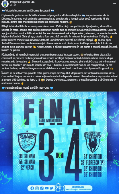 Cu douăzeci de minute înainte de final, Chirițoiu și-a continuat ziua de vis completându-și hat-trick-ul, în timp ce Petre Neagu urma să stabilească scorul final: o victorie cu 4-3 pentru Progresul. Felicitări băieți! Multă baftă în Playout!”, au contat cei de la Progresul Spartac pe Facebook.