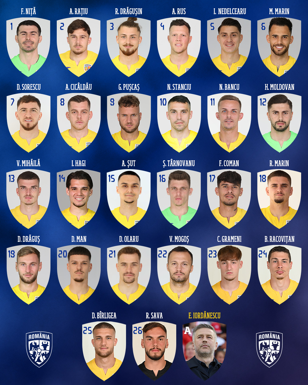 FUNDAȘI: Andrei Rațiu (Rayo Vallecano | Spania, 16/1), Vasile Mogoș (CFR Cluj, 5/0), Radu Drăgușin (Tottenham | Anglia, 15/0), Bogdan Racovițan (Rakow | Polonia, 1/0), Adrian Rus (Pafos | Cipru, 19/1), Ionuț Nedelcearu (Palermo | Italia, 26/2), Nicușor Bancu (Universitatea Craiova, 34/2)