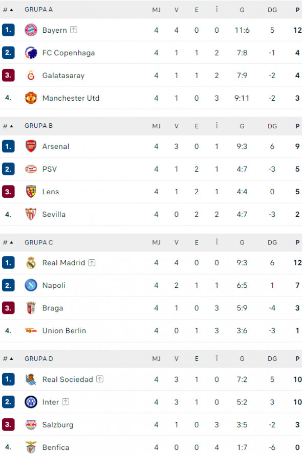Real Madrid, care s-a impus lejer în fața celor de la Braga, scor 3-0, e sigură de prezența în optimi. Bayern a câștigat cu mari emoții duelul cu Galatasaray de pe teren propriu, 2-1, dar cu patru victorii din patru posibile nu mai poate rata calificarea.