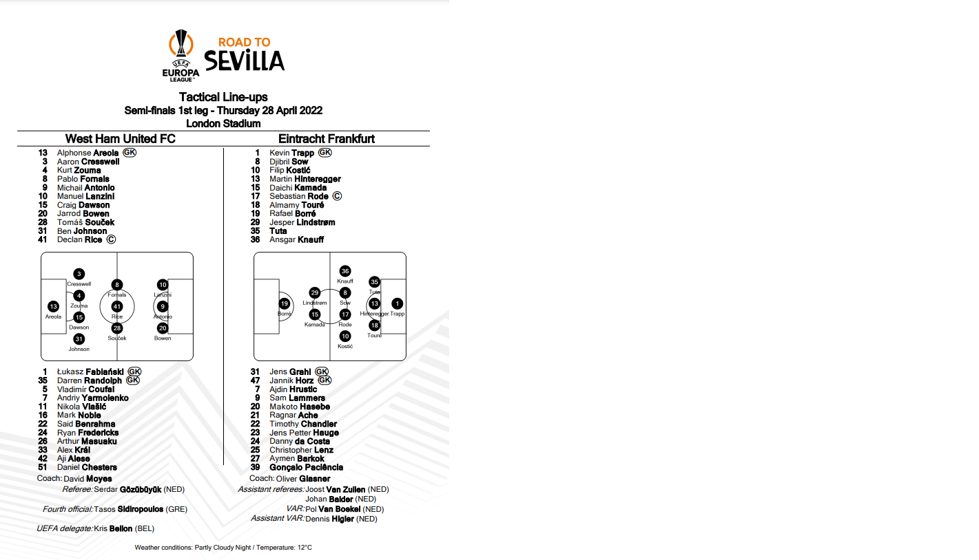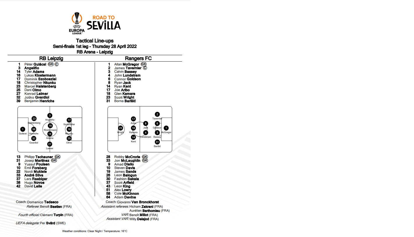 În Europa League, Rangers, fără Ianis Hagi, care este în continuare accidentat, se deplasează în Germania pentru duelul cu RB Leipzig. Duelul germano-britanic din această fază a competiției continuă cu înfruntarea dintre West Ham United și Eintracht Frankfurt, care se va disputa în primă fază la Londra. Gruparea germană este plină de încredere după ce a reușit marea surpriză și a eliminat Barcelona în sferturile de finală, după o victorie de senzație obținută chiar pe Camp Nou în manșa retur.