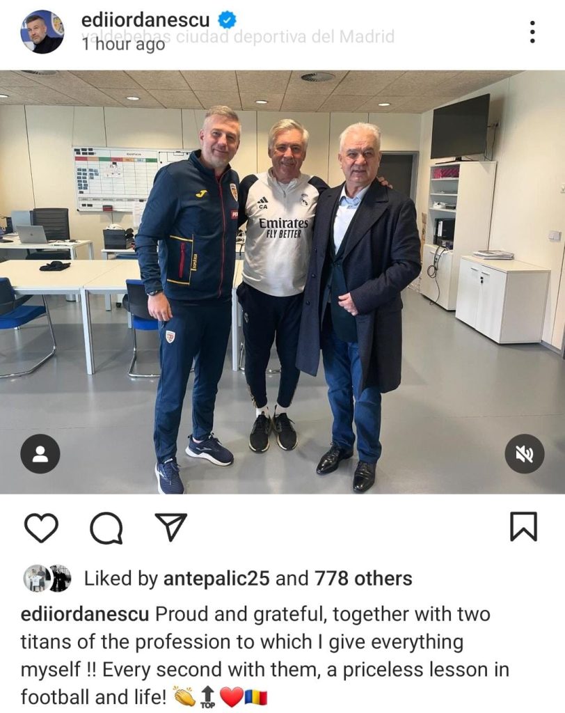 În cadrul unei vizite recente la Madrid, orașul care a fost gazda meciului amical dintre echipele naționale de fotbal ale Columbiei și României, selecționerul echipei naționale a României, Edi Iordănescu, împreună cu tatăl său, Anghel Iordănescu, au avut ocazia să-l întâlnească pe Carlo Ancelotti, antrenorul de renume al echipei Real Madrid.