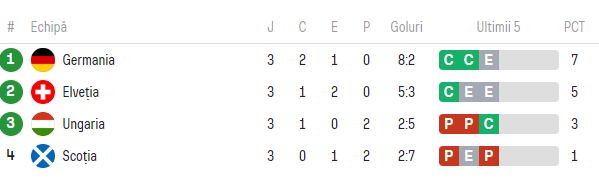 Germania și Elveția se califică direct mai departe, Scoția merge acasă, în timp ce Ungaria se clasează pe locul 3.