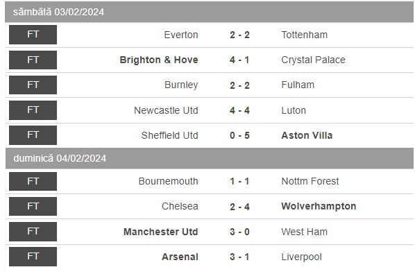 Newcastle-Luton 4-4 a fost partida cu cele mai multe goluri din această rundă. Aston Villa a marcat și ea în voie, în victoria cu 5-0 în fața lui Sheffield United, iar Brighton s-a impus în derby-ul său cu Crystal Palace, 4-1. Wolverhampton a produs șocul etapei, după ce a trecut cu 4-2 pe Stamford Bridge de Chelsea. Man United vede, în sfârșit, lumină după 3-0 pe Old Trafford cu West Ham. E a 4-a victorie din ultimele 5 partide pentru Manchester United.