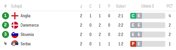 De cealaltă parte, Danemarca a început turneul cu un pas greșit, remizând 1-1 cu Slovenia. În acel meci, desfășurat pe 16 iunie, Christian Eriksen a deschis scorul în minutul 17, dar Erik Janza a egalat în minutul 77. Danezii, conduși de Kasper Hjulmand, speră să se revanșeze în fața Angliei și să obțină o victorie care să le asigure și lor un loc în optimile de finală.