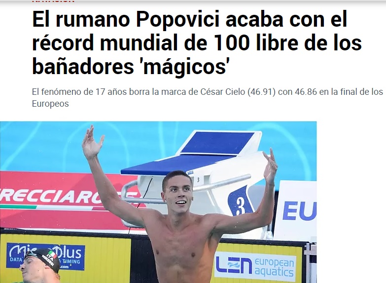 Performanța fabuloasă a lui David Popovici a ajuns și în Spania. Reputata publicație Marca a făcut trimitere la costumele speciale folosite cu ani în urmă, atunci când Cielo a realizat ultimul record.