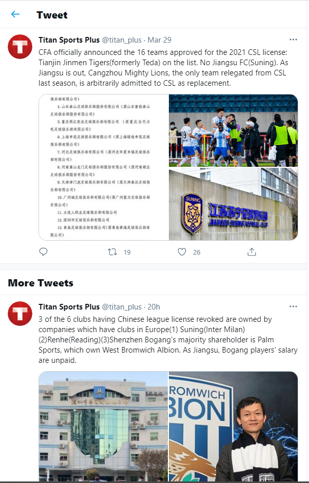 Jiangsu nu este singurul club din fotbalul Chinez care nu a luat licența în acest sezon. Alte cinci cluburi din ligile secunde au avut aceeași soartă. De remarcat este faptul că la trei dintre cluburile care nu au primit licența, acționarii majoritari dețin echipe și în Europa. Este vorba de Jiangsu (acționarul este majoritar la Inter Milano), Beijing Renhe (acționarul deține clubul lui George Pușcaș – Reading) și Shenzen Bogang (acționarul deține clubul West Bromwich Albion).