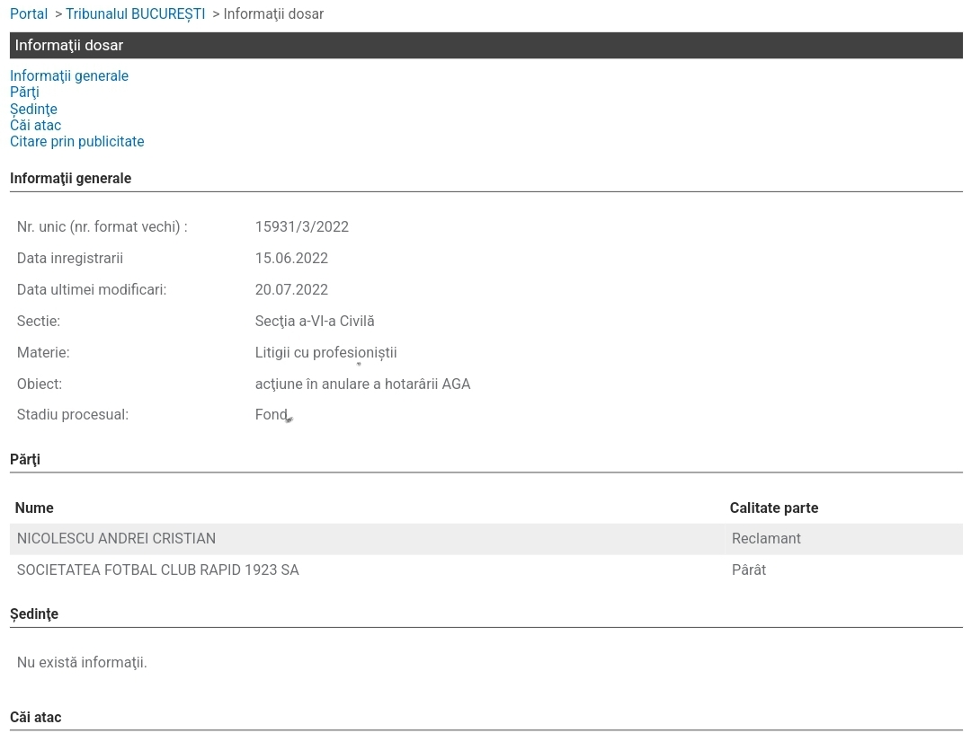 Andrei Nicolescu, fostul vicepreședinte al Rapidului și, în trecut, partener de investiție în cadrul Academiei Rapid cu Victor Angelescu, s-a adresat Instanței, mai precis Tribunalului București și a solicitat anularea hototărârii luată în cadrul Adunării Generale a Acționarilor -SC Fotbal Club Rapid 1923 SA.