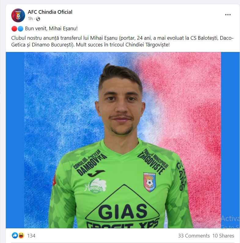 Update, 19 august, ora 13.34. Mihai Eșanu a fost prezentat oficial pe pagina de facebook a grupării din Târgoviște. Portarului i s-a făcut doar o succintă prezentare, în care au fost enumerate formațiile la care a evoluat până la momentul prezent și i s-a urat mult succes în noul sezon. Mai jos puteți vedea amănuntele înțelegerii, așa cum au fost prezentate de Playsport pe 10 august.