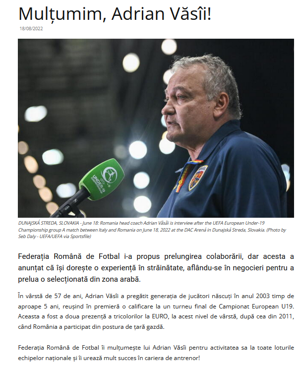 Singurul regret pe care acesta îl are, în momentul de față, este legat de ultima generație antrenată. România U19, sub comanda lui Adrian Văsîi, a reușit, în premieră, calificarea pe teren la Campionatul European Under-19.