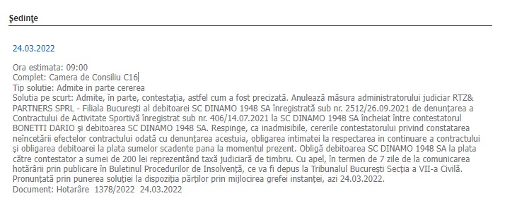 Soluția pe scurt: „Admite, în parte, contestaţia, astfel cum a fost precizată. Anulează măsura administratorului judiciar RTZ& PARTNERS SPRL – Filiala Bucureşti al debitoarei SC DINAMO 1948 SA înregistrată sub nr. 2512/26.09.2021 de denunţarea a Contractului de Activitate Sportivă înregistrat sub nr. 406/14.07.2021 la SC DINAMO 1948 SA încheiat între contestatorul BONETTI DARIO şi debitoarea SC DINAMO 1948 SA.