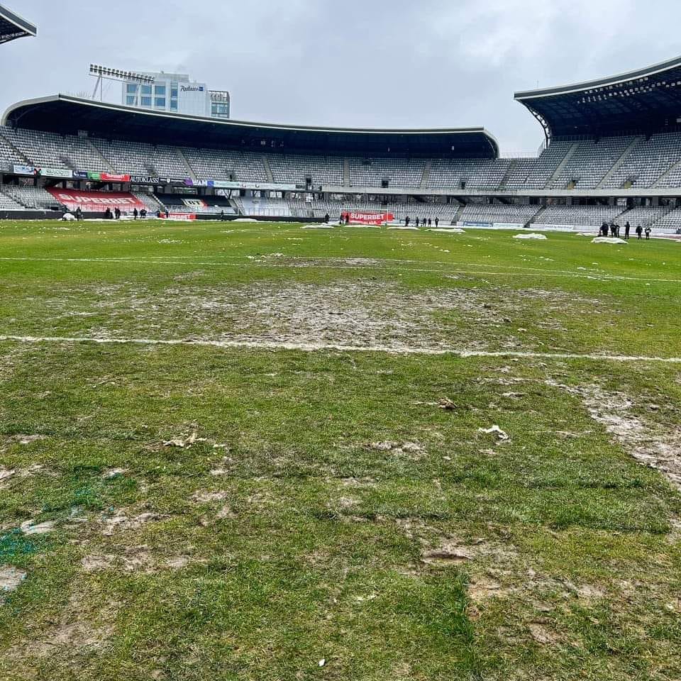 E mai mult lapoviță. (n.r. Terenul a fost decopertat?) Da. Instalația de încălzire funcționează și s-a dat drumul acum două zile. S-a și acoperit cu o preltă gazonul. Va fi destul de moale, dar să sperăm că va rezista. S-a lansat deja o licitație de câteva zile, în martie se va schimba tot gazonul.