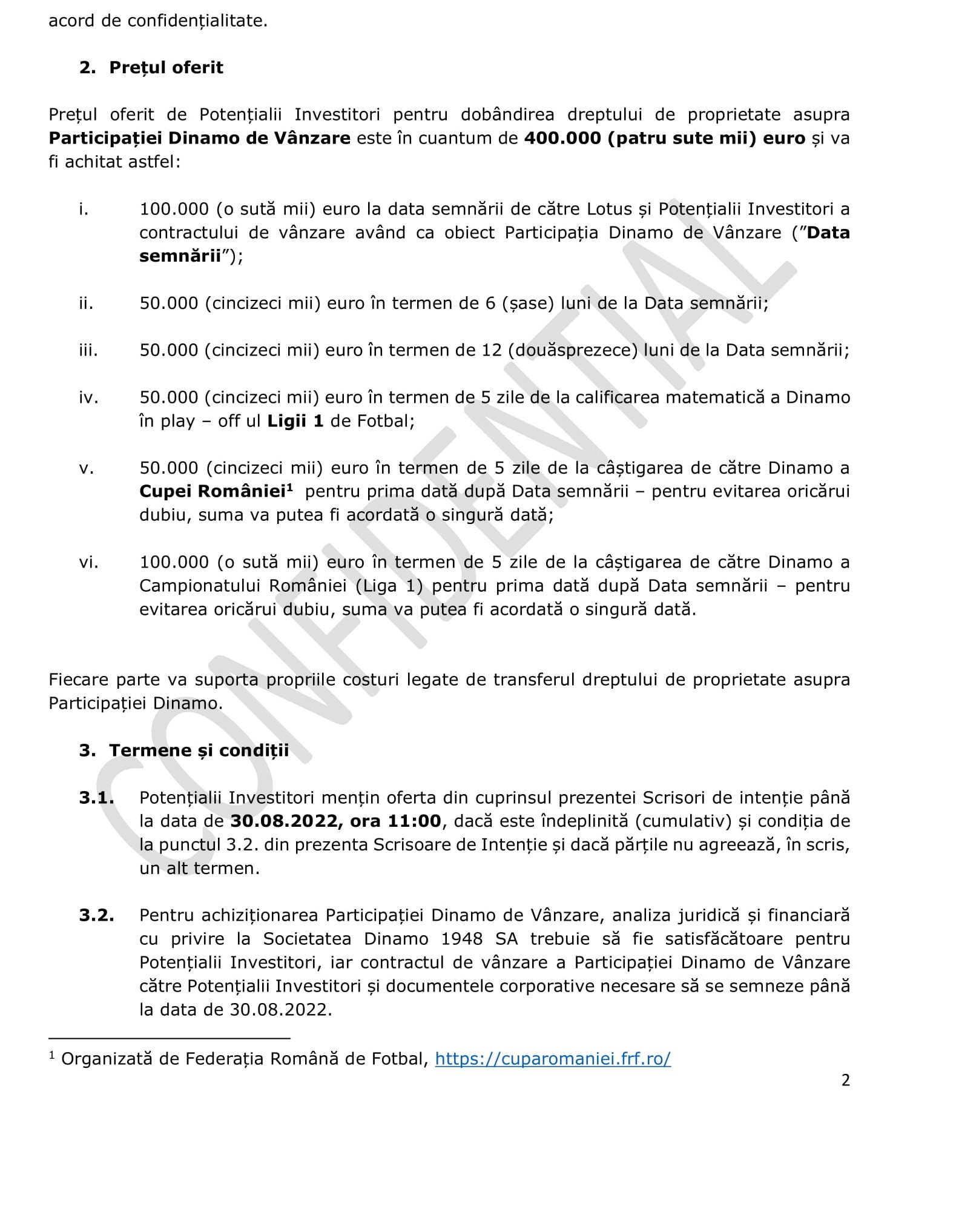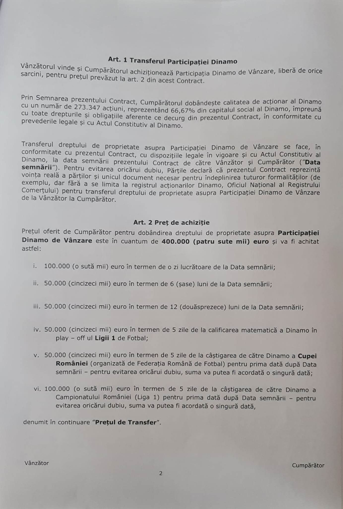Conform „contractului de vânzare acțiuni” oferta este pentru 66,67%, – semn că între părți, direct sau prin intermediul avocatului Justin Armașu, negocierile au fost acceptate-, din pachetul Lotus Perfect Products în cadrul SC Dinamo 1948 SA, care deține un procent de 72,87%. One a oferit în schimbul procentului menționat 400.000 euro, sumă segmentată în felul următor: